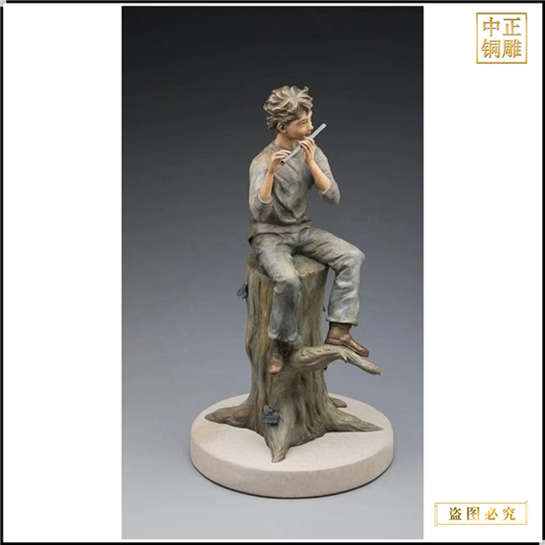 小男孩吹笛子銅雕塑
