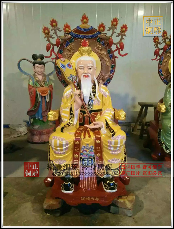 靈寶天尊在道教神系中出現,則晚于元始天尊,是南北朝時才有的。它被說成是由混太無元玄黃之氣所化生,又稱太上道君,也隨劫運出法度人.道德天尊即老子,又稱太上老君。為了構成三清尊神的等級序列,它被說成是由冥寂玄通元玄白之氣化生的。
